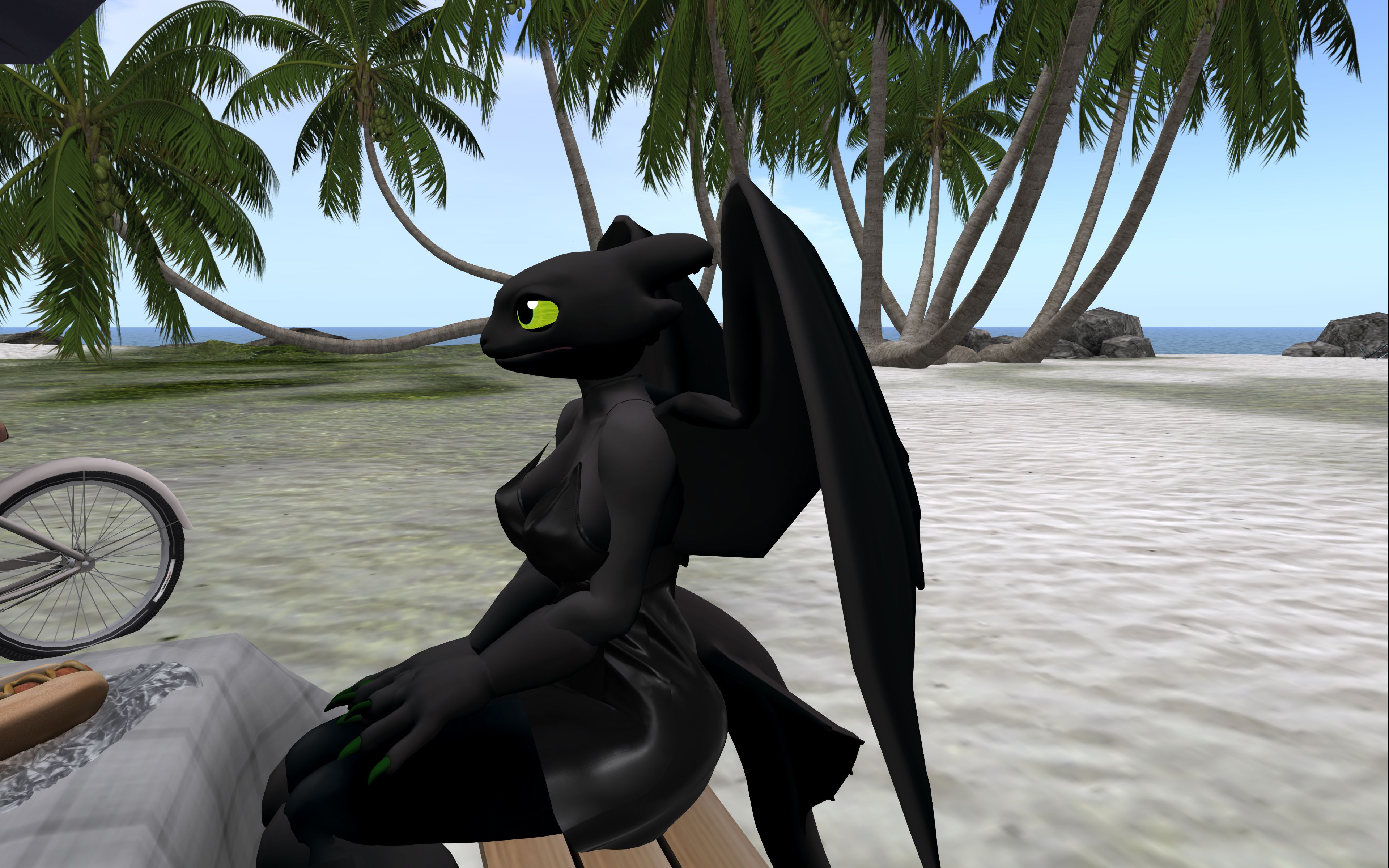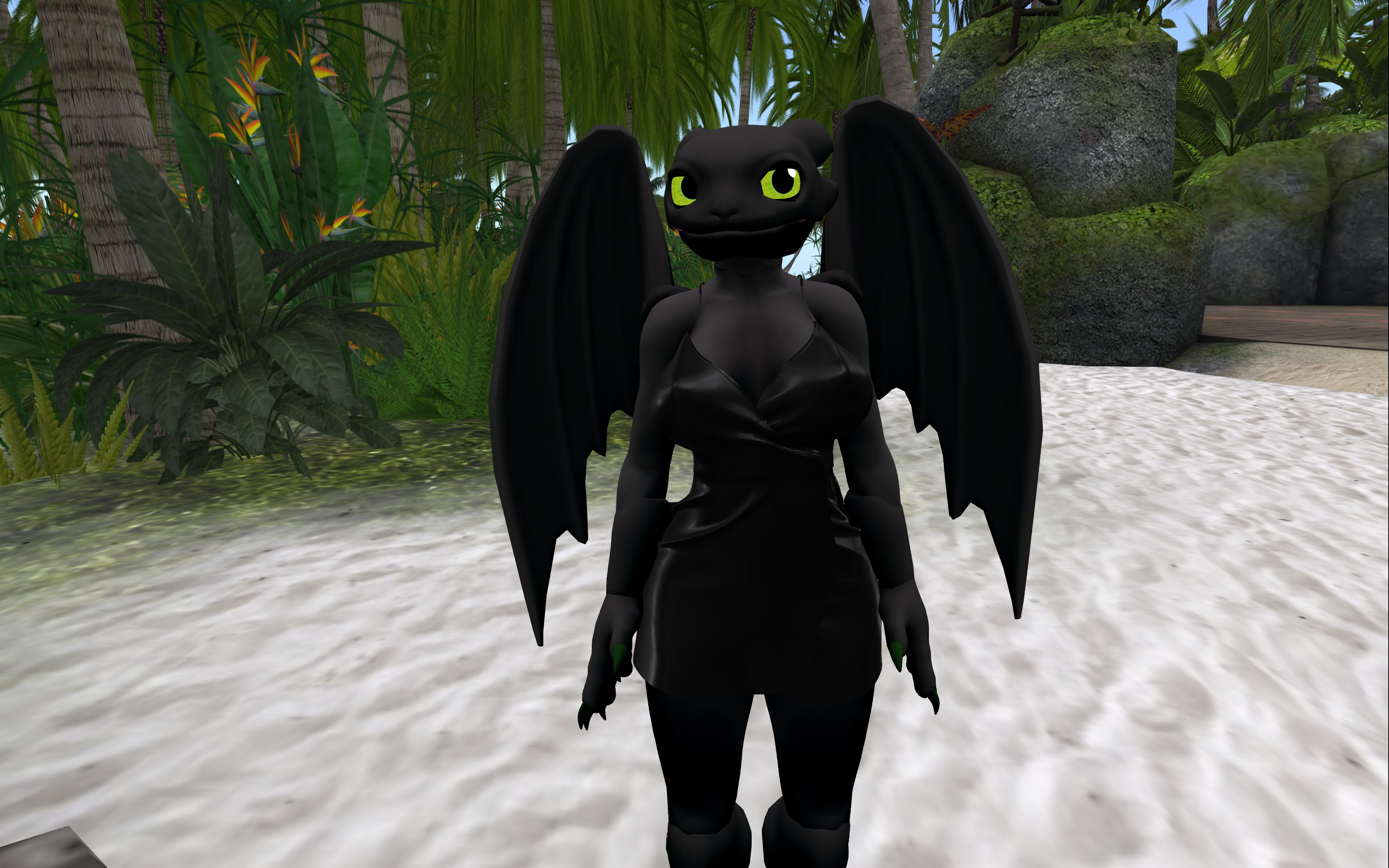 Nichelle is an anthropomorphic nightfury dragoness, standing at human height of 1,85m. She has smooth black scales, which give her a sleek, almost glossy appearance. Her eyes are a soft spring green, with pupils that can dilate from cat-like slits to almost square, characteristic of nightfury dragons. She often wears leather or rubber harnesses, traditional attire that serves both functional and decorative purposes. But she also loves ballroom dresses in crystal colors.